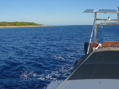 Just at sunset we sailed close past the twin atolls of Tepotu and Napuka. They would be a great stop time-wise, except neither has a pass and there's really no place to anchor. We had one report from an SSCA newsletter of a boat that stopped there--he hand set his anchor on top of the coral, and his stern was in 100' feet. Another boat (Migration) tried to stop there 2 years ago, and couldn't. We could see a few buildings ashore, and a guy out fishing in a plastic kayak. But it was very close to sunset, so we sailed on by.